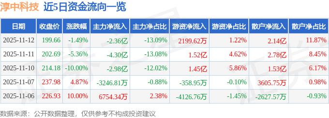 11月12日的资金流向数据方面,主力资金净流出2.36亿元,占总成交额13.09%,游资资金净流入2199.62万元,占总成交额1.22%,散户资金净流入2.14亿元,占总成交额11.87%。